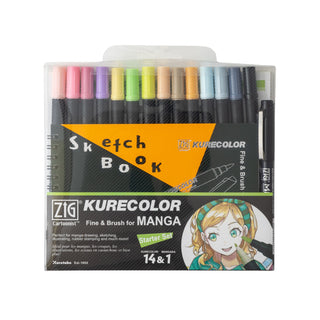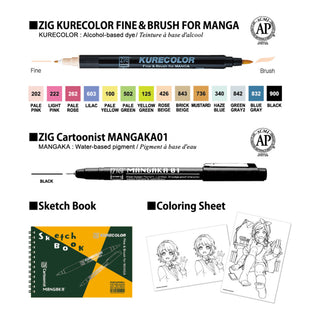 Set Contents: 14 KURECOLOR Fine & Brush for MANGA markers (Pale Pink, Light Pink, Pale Rose, Lilac, Pale Yellow, Pale Green, Yellow Green, Rose Beige, Brick Beige, Mustard, Haze Blue, Green Gray, Blue Gray, Black), 1 ZIG CARTOONIST MANGAKA 01 fineliner (Black), 1 sketchbook, 2 coloring sheets